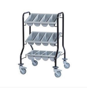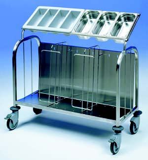 Cultery and tray dispense trolleys provide a way to neatly place and provide clean trays and cutlery for your guests, or a mobile unit for waiting staff to access the cutlery and crockery needed during customer serving.